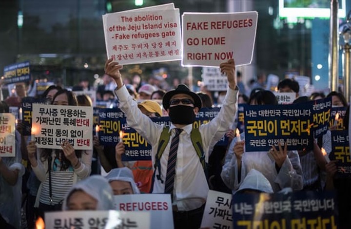 وتشير الصحيفة إلى أن المئات تظاهروا في سيول ضد قبول اللاجئين، وسموهم “لاجئئن كاذبين”، واتهموهم بأنهم مهاجرون اقتصاديون وليسوا لاجئين، بالإضافة إلى أن منتديات على الإنترنت لأمهات جيجو، التي عادة يتم فيها النقاش حول أفضل عربات الأطفال وأفضل رياض الأطفال، تحولت إلى منصات سياسية في الأشهر الأخيرة.