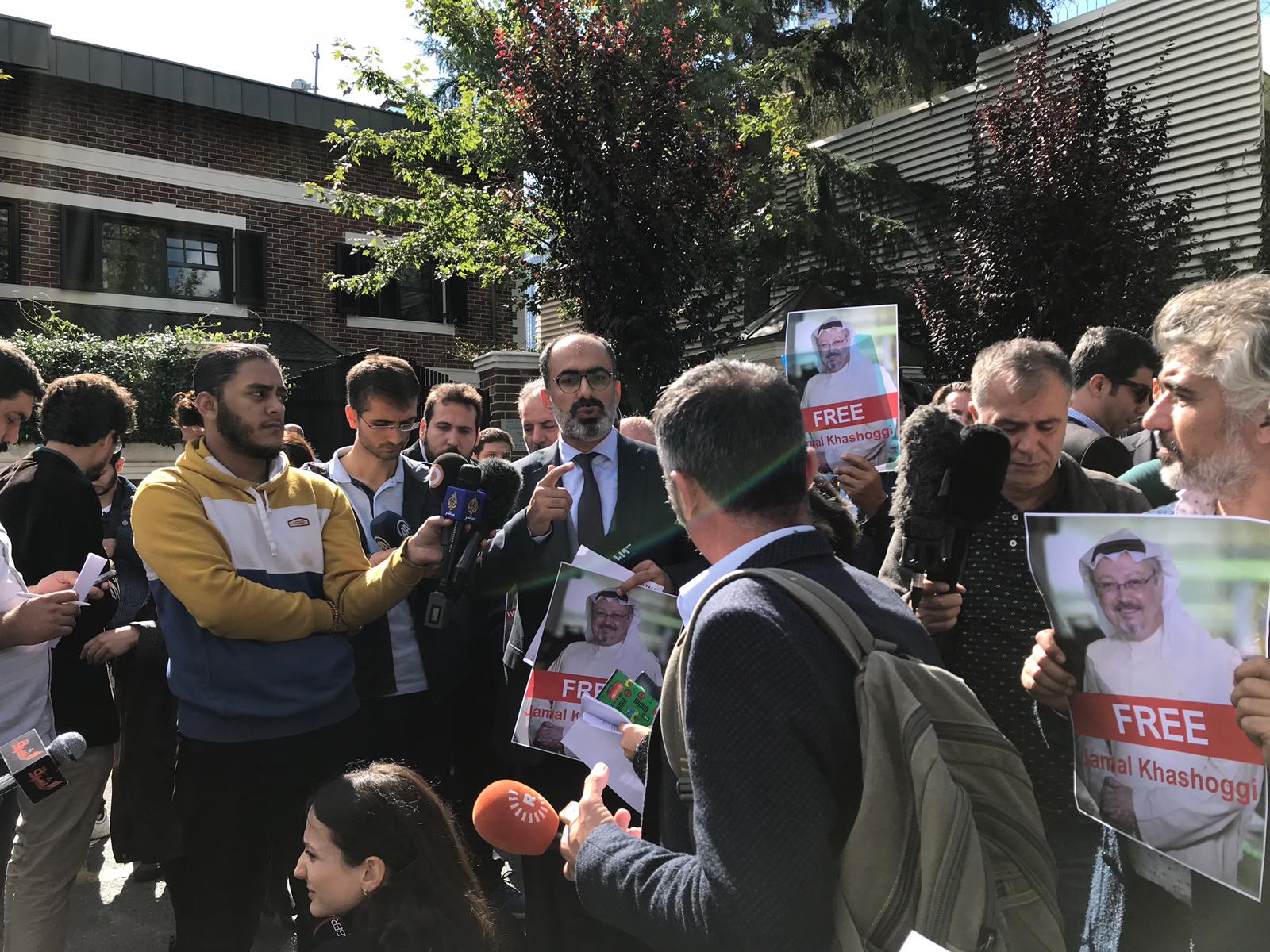 طالب «بيت الإعلاميين العرب» في تركيا، اليوم الجمعة، أثناء تنظيمه وقفة احتجاجية أمام القنصلية السعودية في إسطنبول بالكشف عن مصير الإعلامي السعودي جمال خاشقجي المختفي منذ أربعة أيام .