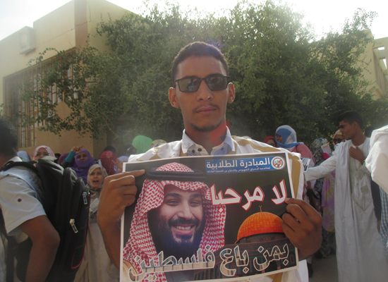 ورفع الطلاب، صورا لابن سلمان كتب علها «لا مرحبا بزيارة أبو منشار» وأخرى كتب عليها «لا تندس أرض موريتانيا»، وهتفوا بشعارات بينها «لا مرحبا بقاتل أطفال اليمن» و«نرفض زيارة من باع فلسطين».