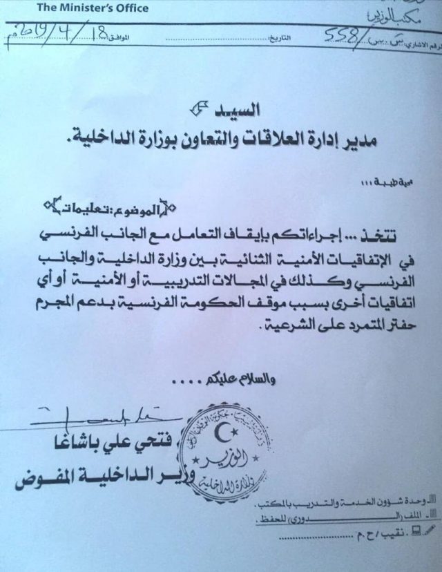 وأعلن وزير الداخلية بحكومة الوفاق، فتحي باش آغا، تعليق التعاون الأمني مع فرنسا، ووقف الاتفاقات الأمنية الثنائية والمجالات التدريبية والأمنية، بسبب الدعم الفرنسي لحفتر.