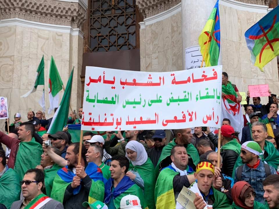 ورفع المتظاهرين لافتات تطالب برحيل النخبة الحاكمة أو ما يسمونهم رموز «النظام البوتفليقي»، في إشارة إلى الرئيس المؤقت عبد القادر بن صالح ورئيس الحكومة نور الدين بدوي، بالإضافة إلى لافتة كبيرة كتب عليها «الشعب يريد محاسبة السعيد بوتفليقة (شقيق الرئيس المستقيل) زعيم العصابة».