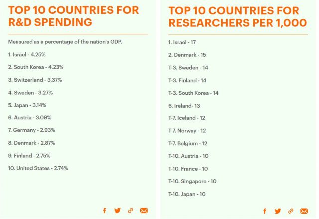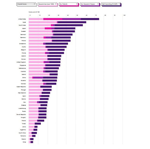 وتهيمن الدول الأوروبية على المراكز العشرة الأولى للتصنيف، لكن الدول الثلاث الأكثر ابتكارًا هي الولايات المتحدة وإسرائيل وكوريا الجنوبية.