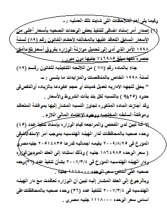 وكشف التقرير أيضًا عن مخالفات مالية شابت عملية انشاء 45 وحدة صحية فى محافظاتكفر الشيخ وبنى سويف والبحيرة والغربية بمبلغ 38 مليون و 924 ألف جنيه، تمثلت في إسناد العملية لمجلس الدفاع الوطني كأمر مباشر بأسعار أعلى من الأسعار السابق التعاقد بالمخالفة لأحكام القانون الذي يقضي بأحقية الجهة الإدارية تعديل كميات أو حجم عقودها بالزيادة أو النقص في حدود (25%) بالنسبة لكل بند بذات الشروط والأسعار الصفقة الأصلية ، مما تسبب في تحميل الوزارة بفروق أسعار قيمتها 33 مليون و614 ألف دون مبرر.
