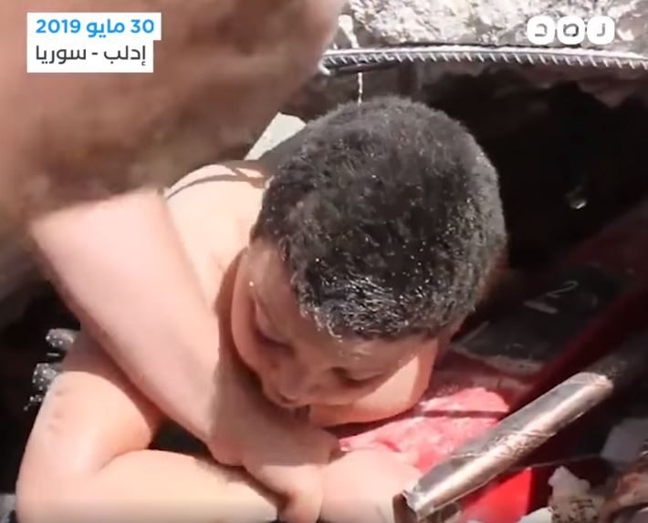 لحظات مؤثرة لإنقاذ طفل سوري من تحت الأنقاض بعد يوم دموي من قصف طائرات النظام على إدلب .