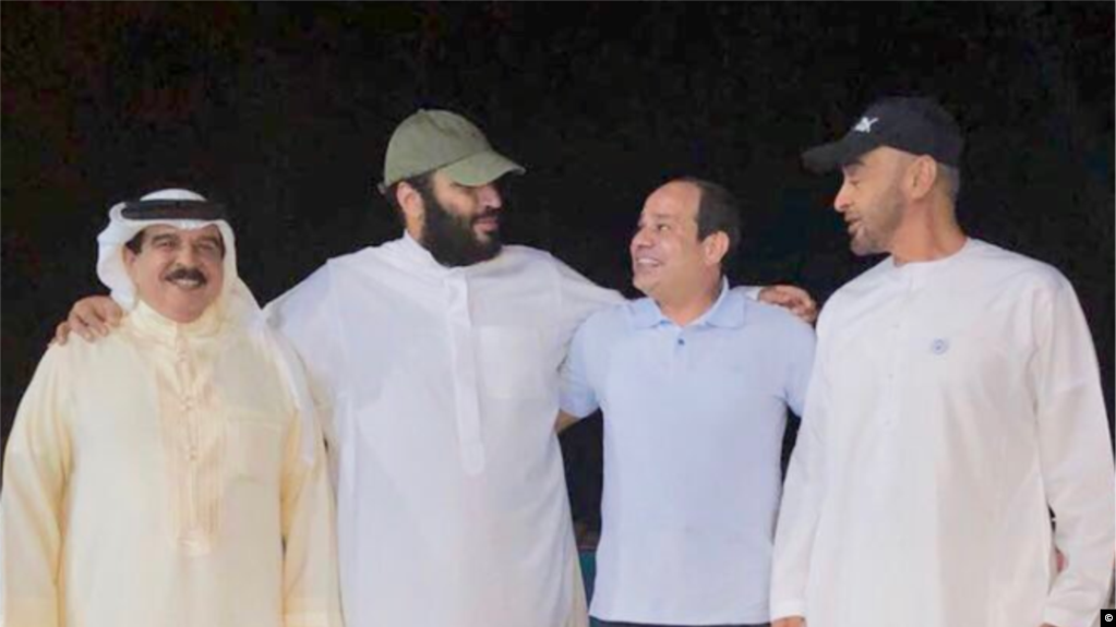 ونشر الأستاذ الجامعي على هاشتاج #محمد مرسي، صورة تجمع السيسي وبن سلمان وبن زايد وملك البحرين قائلا «السيسي القاتل مع أصدقائه المقربين».