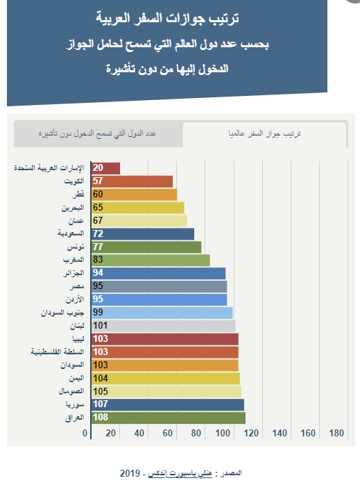 واحتلت دولة الإمارات الصدارة بين الدول العربية والمرتبة العشرين عالميا، إذ يسمح جواز سفرها لحامله بالتنقل بحرية دونما الحاجة لتأشيرة دخول في 167 دولة حول العالم.