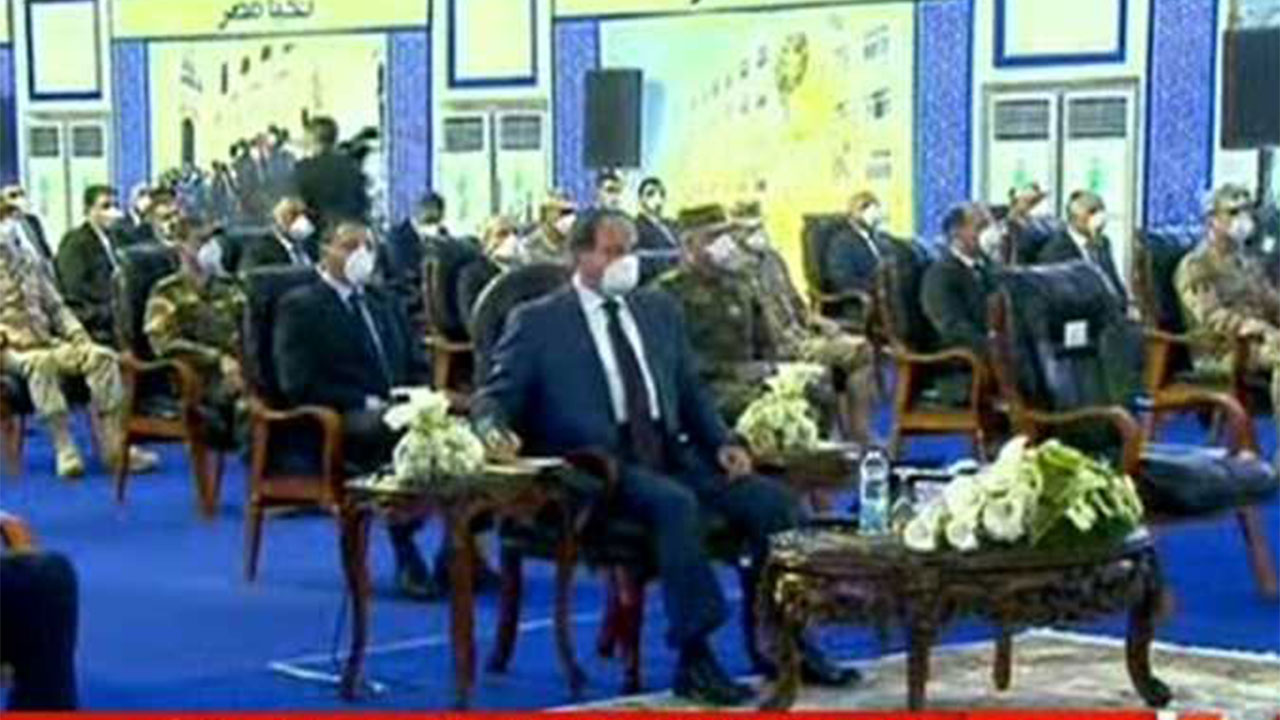 وظهر السيسي مرتديا الكمامة كإجراء احترازي للوقاية من فيروس كورونا، كما قام جميع الحضور بارتدائها أيضا، وترك مسافة كبيرة بين بعضهم البعض.