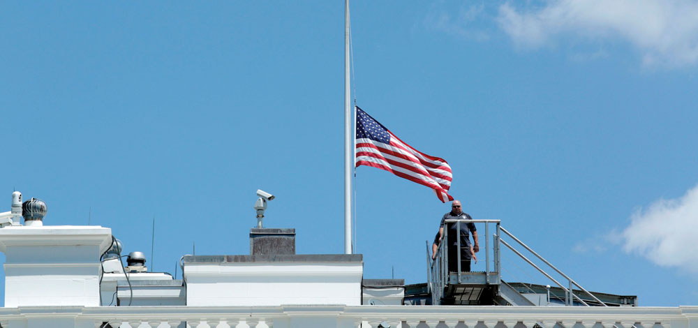 وقال ترامب في تغريدة على حسابه بموقع تويتر: «الأعلام الأميركية ستنكس للمنتصف فوق المباني الفيدرالية، والنصب الوطنية خلال الأيام الثلاثة المقبلة تكريما لضحايا فيروس كورونا».
