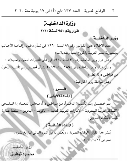 نشرت الجريدة الرسمية قرار وزير الداخلية رقم 951 لسنة 2020، بشأن دخول وإقامة الأجانب بجمهورية مصر العربية، وجاء القرار بتحصيل رسم تأشيرة الدخول من مواطنى دول مجلس التعاون الخليجى «المملكة العربية السعودية، الإمارات العربية المتحدة، الكويت، البحرين، سلطنة عمان» طبقأ لأحكام القانون.