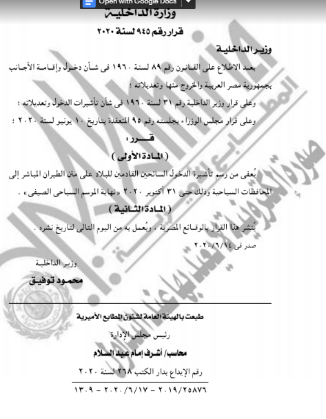 كما نشرت الجريدة الرسمية قرار وزير الداخلية رقم 945 لسنة 2020، بإعفاء السائحين القادمين للبلاد على متن الطيران المباشر إلى المحافظات السياحية من رسوم التأشيرة، وذلك حتى 31 أكتوبر 2020 «نهاية الموسم الساحى الصيفى».