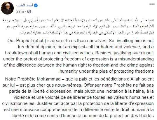 أكد شيخ الأزهر أحمد الطيب أن الإساءات للإسلام والنبي محمد ليست حريةَ رأيٍ، بل دعوة صريحة للكراهية والعنف، وانفلات من كل القيم الإنسانية والحضارية.