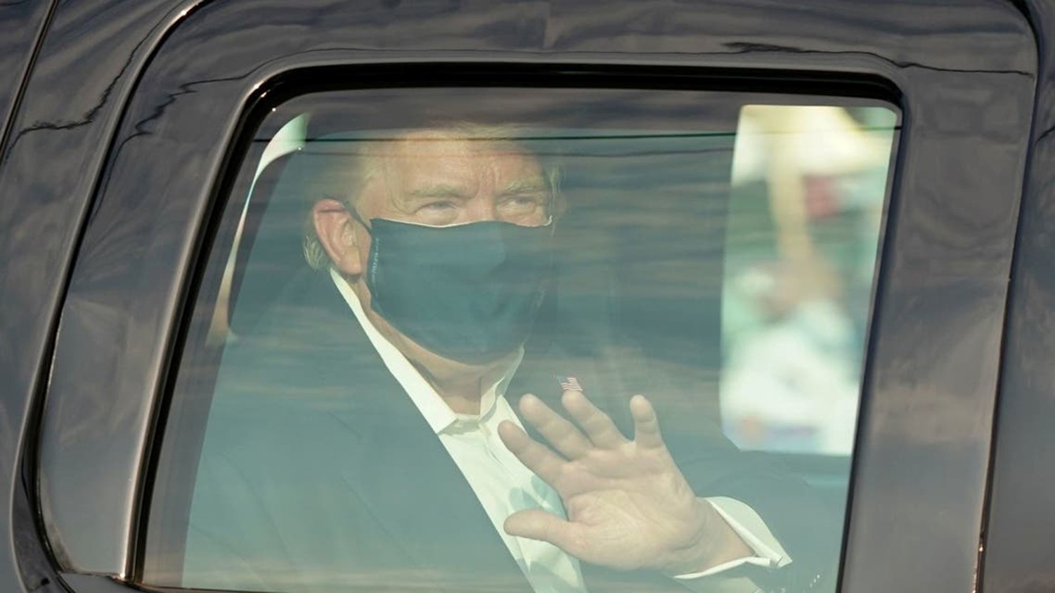 وارتدى ترامب كمامة عندما كان في داخل السيارة، فيما لوح بيديه لتحية مؤيديه.