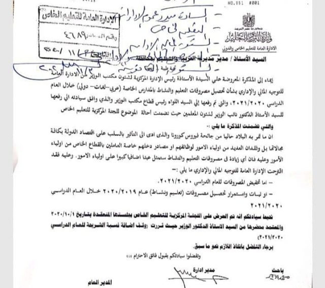 وجاء قرار الوزارة عبر منشور تم إرساله إلى المديريات التعليمية، بشأن تحصيل مصروفات التعليم والنشاط بالمدارس الخاصة عربي ولغات ودولي خلال العام الدراسي 2020/2021.