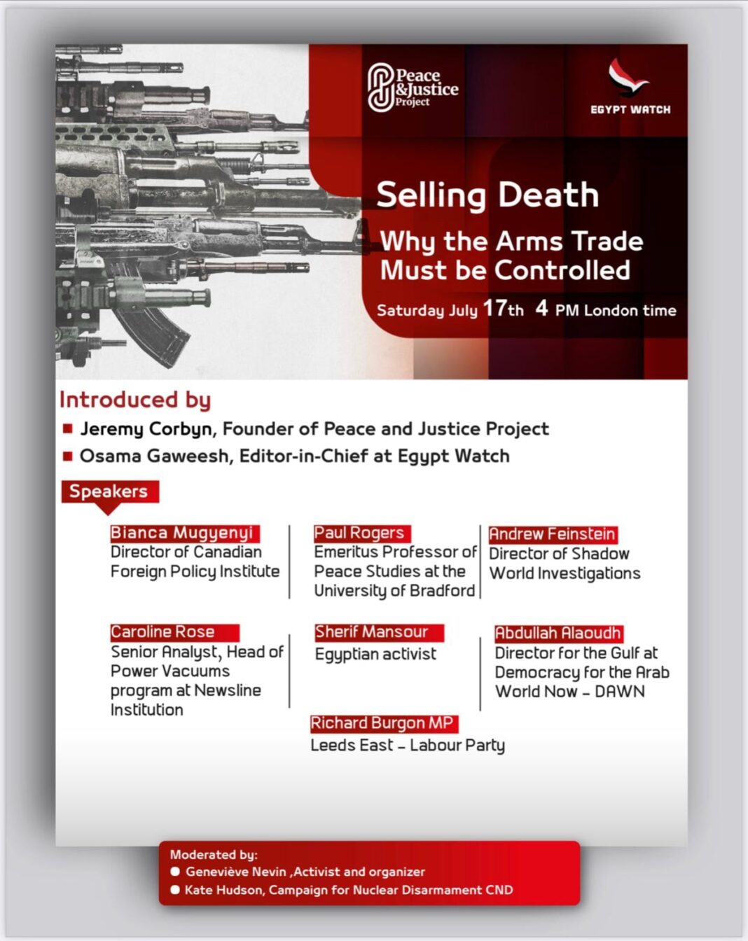 أعلنت كلا من مؤسسة إيجبت ووتش في بريطانيا مؤتمرا دوليا افتراضيا بعنوان «بيع الموت لماذا يجب السيطرة على تجارة الأسلحة»، بمشاركة عدد كبير من البرلمانيين والباحثين والنشطاء من الولايات المتحدة وبريطانيا وكندا ودول عربية.
