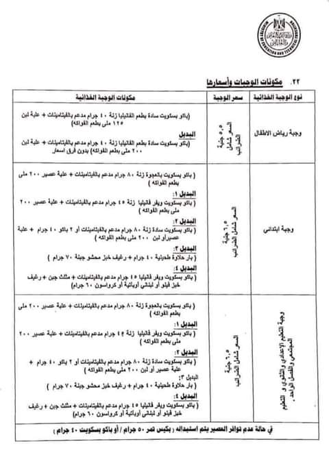 ويذكر أن مستند بأسعار الوجبات قد تم تسريبه أمس على مواقع التواصل حيث يترواح سعر الوجبة المدرسية ما بين 5.5 و6.5 جنيهات، وتحتوي على بسكويت وعبوة لبن أو عصير.