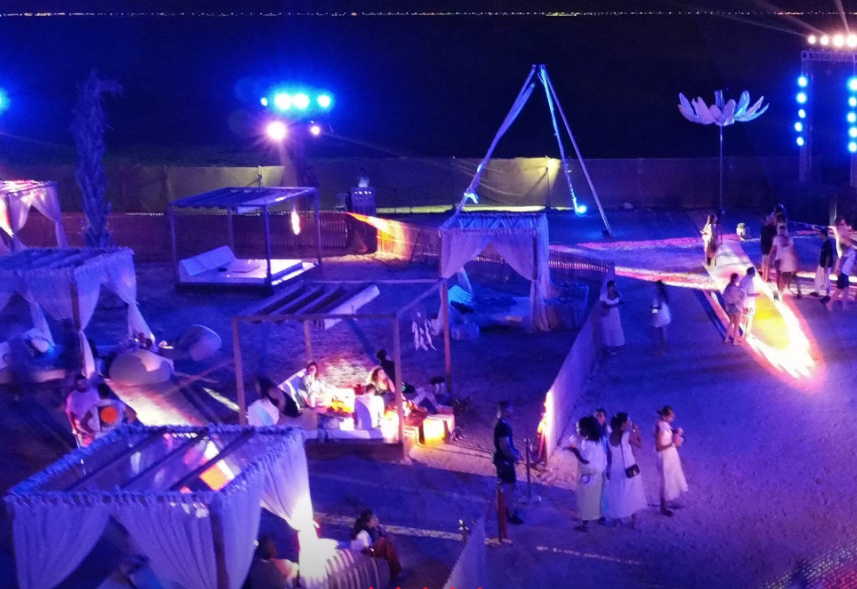 وبعد غروب الشمس، تصدح الموسيقى الغربية عالية من فوق مسرح اقيم على الرمال.