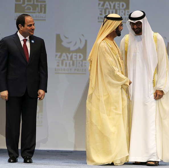 Egypt's President Abdel Fattah al-Sisi (L) stands next to Sheikh Mohammad bin Rashed al-Maktoum (C), who is also vice president and prime minister of the United Arab Emirates, and Sheikh Mohammed bin Zayed al-Nahyan (R), Crown Prince of Abu Dhabi and the UAE's deputy commander-in-chief of the armed forces, during the opening of the World Future Energy Summit at the National Exhibition Center (ADNEC) in the Emirati capital Abu Dhabi on January 19, 2015. AFP PHOTO / KARIM SAHIB (Photo credit should read KARIM SAHIB/AFP via Getty Images)