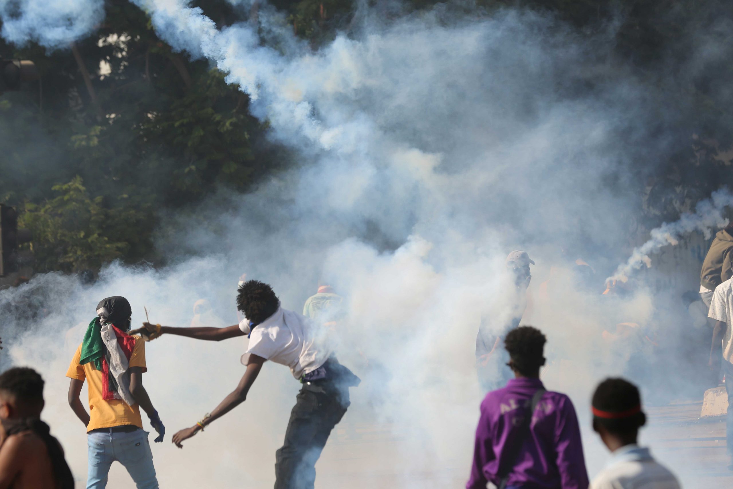 ورد المتظاهرون بإلقاء الحجارة على قوات الشرطة، ومحاولة إرجاع عبوات الغاز المسيل للدموع عليها.