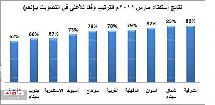 وكانت نسبة المشاركة في ذلك الاستفتاء قد تخطت 41.2% من إجمالي الناخبين الذين لهم حق التصويت في مارس الماضي، وتنشر "رصد" تلك النسب وخاصة في المحافظات التي سيدء التصويت عليها السبت القادم، والتي تشمل محافظات (القاهرة ، الإسكندرية ، الشرقية ، الدقهلية ، الغربية ، جنوب سيناء ، شمال سيناء ، أسيوط ، سوهاج ، أسوان).