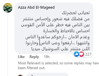 وقالت السيدة عزة في تعليقها على صورة السيسي واستقباله لوزير الدفاع :«من فضلك فيه شعور وإحساس منتشر بين الناس فيه خطر على الأمن القومي، وإحساس بالإحباط والخسارة وعدم الأمان، أرجوكم ساعدوا الناس وانتبهوا ارفعوا وعى الناس وحاربوا اللى منتشر على السوشيال ميديا».