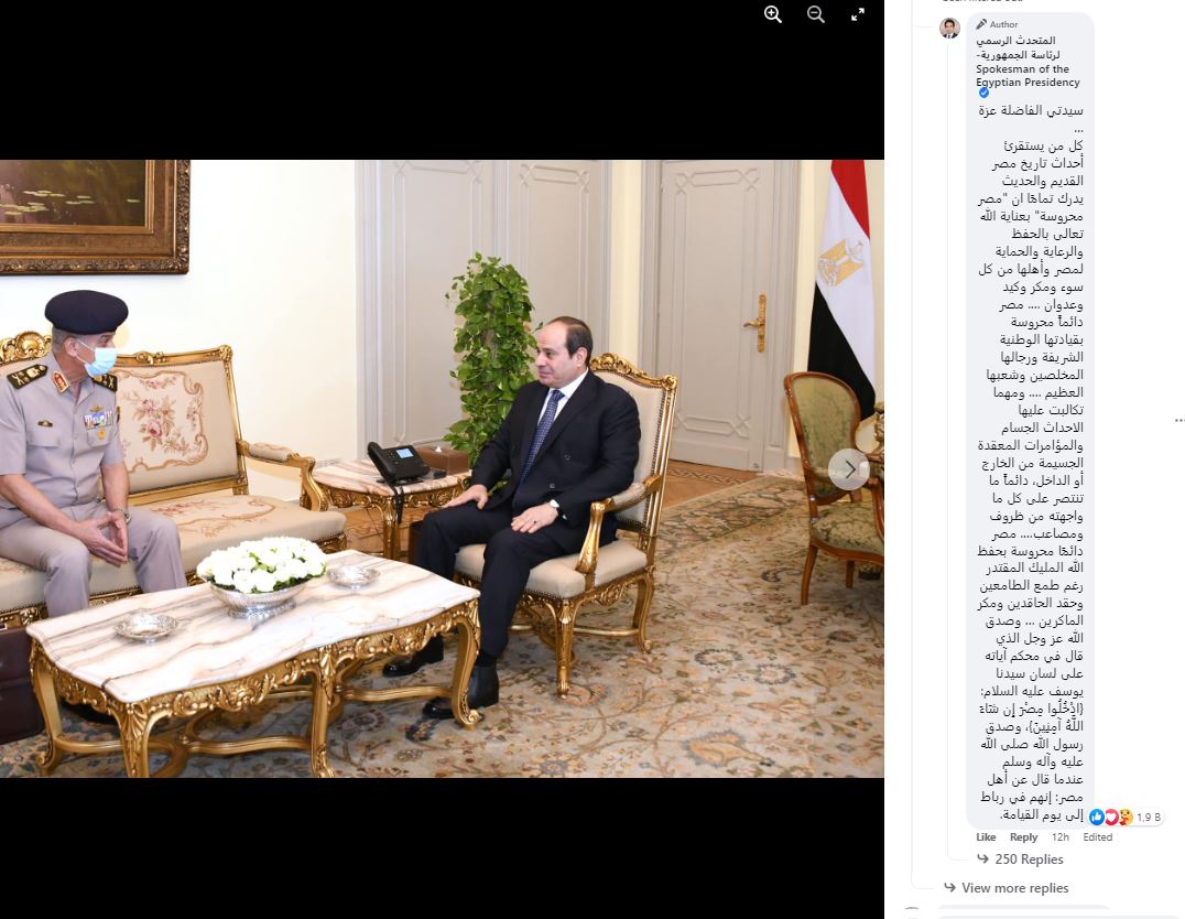 فيرد عليها المتحدث الرسمي قائلا:«كل من يستقرئ أحداث تاريخ مصر القديم والحديث يدرك تمامًا أن “مصر محروسة” بعناية الله تعالى بالحفظ والرعاية والحماية لمصر وأهلها من كل سوء ومكر وكيد وعدوان، مصر دائماً محروسة بقيادتها الوطنية الشريفة ورجالها المخلصين وشعبها العظيم …. ومهما تكالبت عليها الاحداث الجسام والمؤامرات المعقدة الجسيمة من الخارج أو الداخل، دائماً ما تنتصر على كل ما واجهته من ظروف ومصاعب».