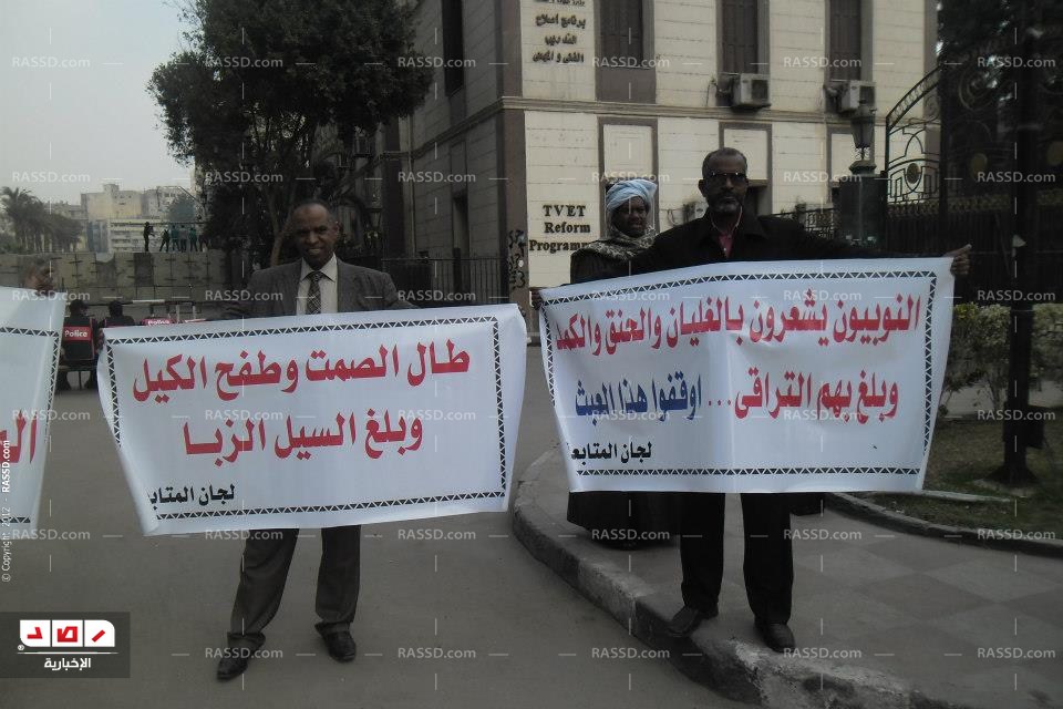 نظم عدد من أبناء النوبة وقفة احتجاجية صباح اليوم (الاربعاء) أمام مجلس الشورى بشارع قصر العيني، اعتراضا على تهميشهم، وعدم تمثيلهم بمجلس الشورى من خلال الــ90 عضو المعينين،مطالبين بحقهم في التمثيل بالشورى وأخذ حقهم من خلال رد أرض النوبة القديمة إليهم مرة أخرى بعد ثبات منسوب النيل أمام السد العالي.