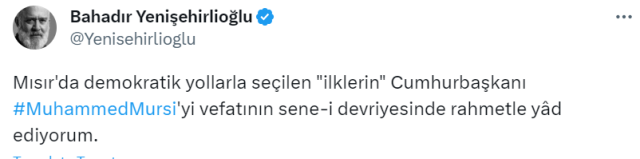 قال عضو مجلس النواب التركي والممثل «بهادير شهيرلي أوغلو» عبر حسابه الشخصي على تويتر في ذكرى وفاته الرابعة: «رحمة الله على أول رئيس منتخب ديمقراطيا في مصر محمد مرسي، في ذكرى وفاته السنوية».