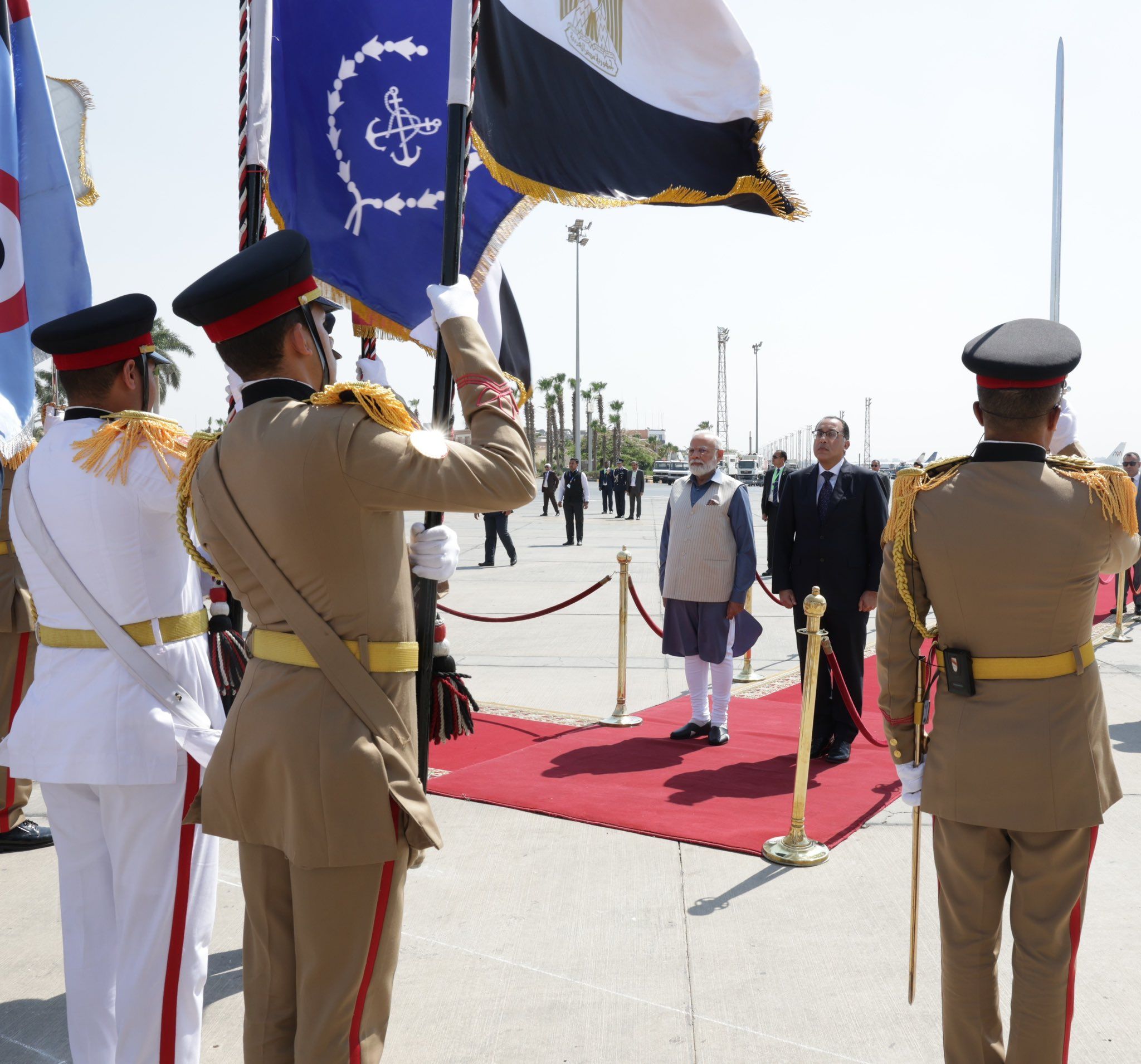 استقبل مصطفى مدبولي، رئيس الوزراء، عصر اليوم، بمطار القاهرة الدولي، ناريندرا مودي، رئيس وزراء الهند، الذي يزور مصر زيارة دولة، بدعوة من عبد الفتاح السيسى.