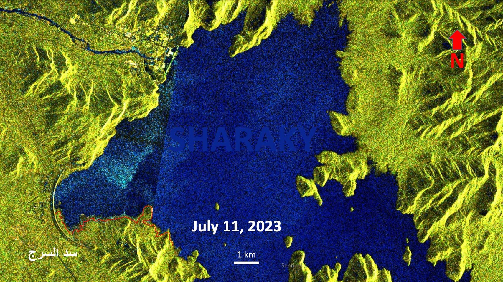 وأوضح عباس شراقي أن صور الأقمار الاصطناعية تظهر اقتراب بحيرة سد النهضة رويدا رويدا من مستوى التخزين الثالث الذي توقف في 11 أغسطس 2022 عند منسوب 600 متر فوق سطح البحر، بإجمالي تخزين 17 مليار متر مكعب، فيما تبقى حوالي 3 أيام (الجمعة 14 يوليو 2023) للوصول إلى منسوب 600 متر (عند الخط الأحمر فى الصورة).