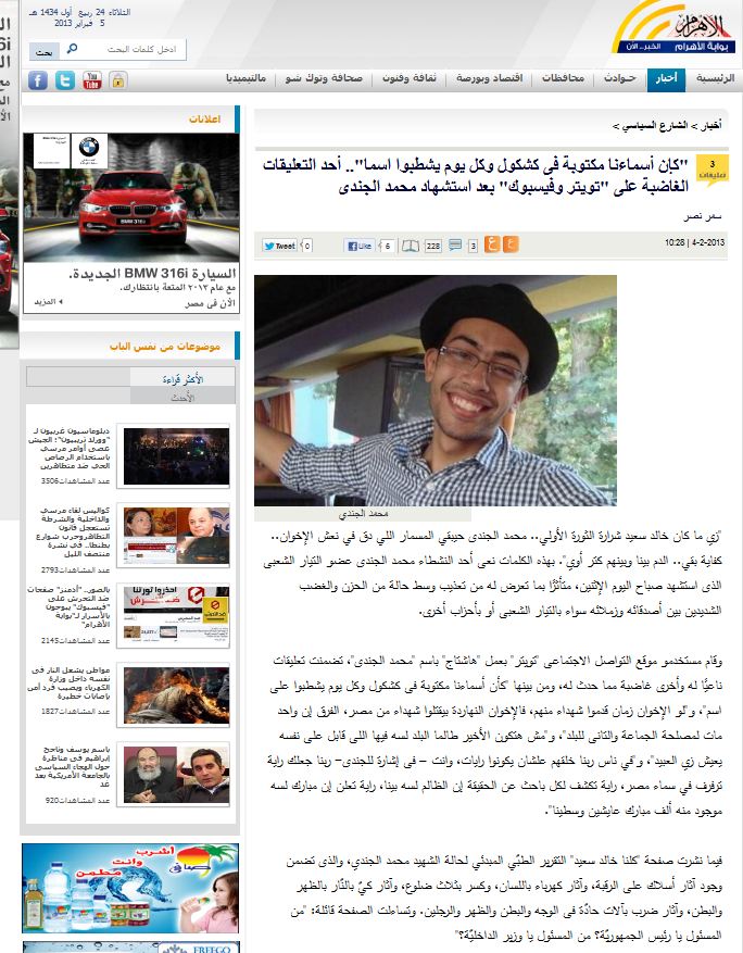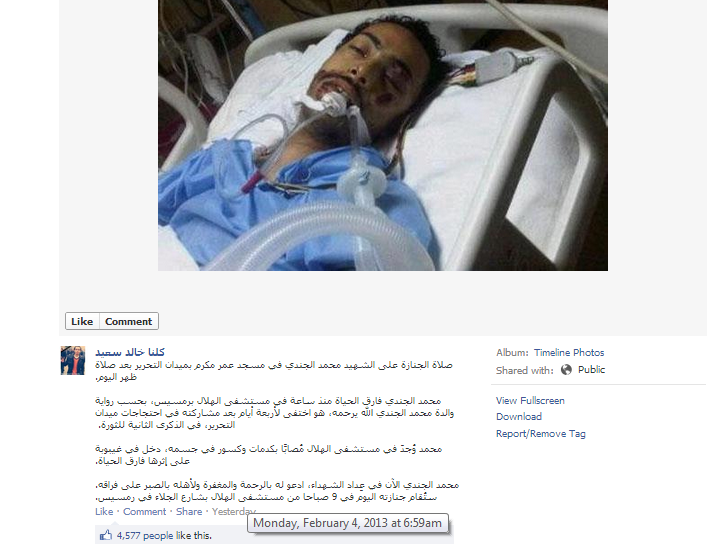 وبالبحث عن هذا التقرير وجدنا أن أدمن الصفحة قد "عدّل" هذا المنشور ليكتفي بذكر موعد ومكان صلاة الجنازة وأوردت بعض تفاصيل عن ملابسات وفاة محمد الجندي.