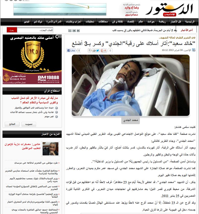 وقالت "كلنا خالد سعيد" أمس أن التقرير كشف عن وجود آثار أسلاك على الرقبة، آثار كهرباء باللسان، كسر بثلاثة ضلوع، آثار كي بالنّار بالظهر والبطن، آثار ضرب بآلات حادّة في الوجه ومؤخرة الرأس والبطن والظهر والرجلين، وأعلنت عن موعد ومكان الجنازة، ونقلت عن الصفحة عدد من وسائل الإعلام هذا "التقرير المبدئي".