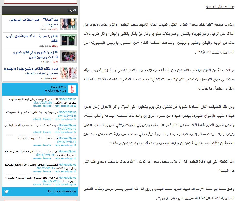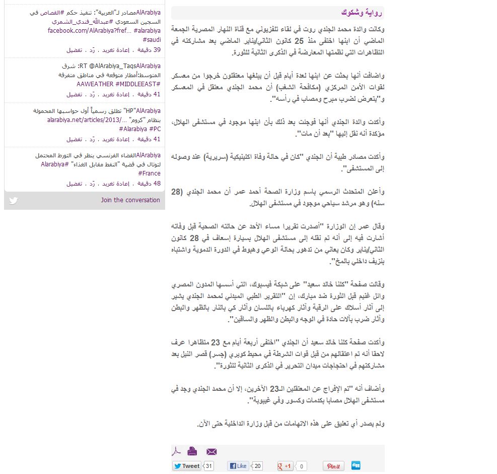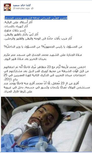 نشرت صفحة كلنا خالد سعيد أمس ما أدعت أنه التقرير الطبي المبدئي الخاص بمحمد الجندي ،عضو التيار الشعبى، إلا أنها عدلته بعدها بالكلية بعد أن تناقلت بعض وسائل الإعلام التقرير.