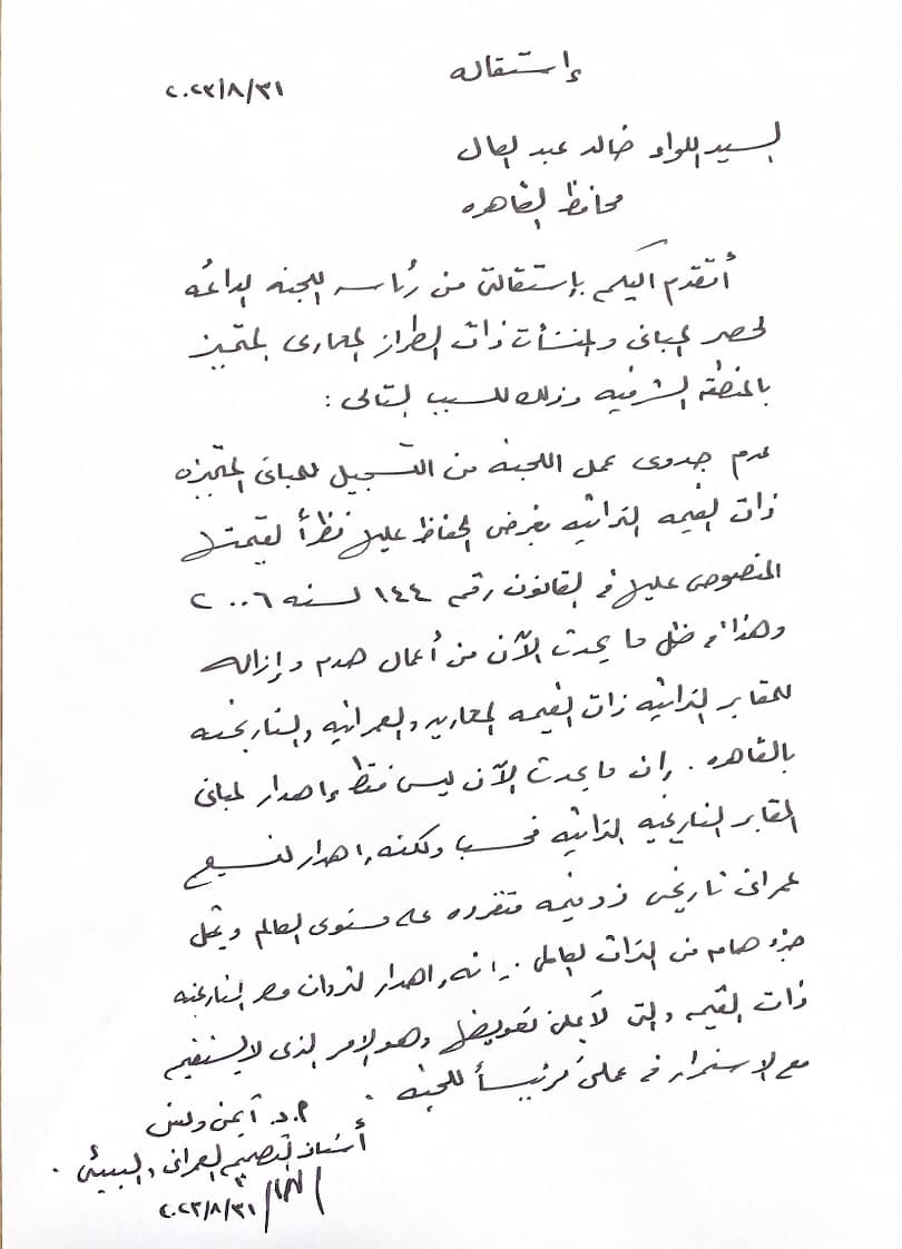 “أتقدم إليكم باستقالتي من رئاسة لجنة حصر المباني والمنشآت التراثية المميزة بالقاهرة، وذلك للسبب التالي: