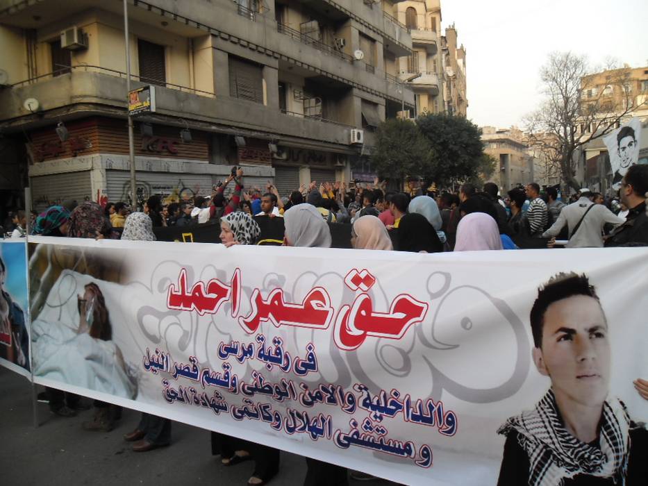 كما رفعوا لافتات عليها بعض صور الشهداء ولافتات مكتوب عليها "حق عمر احمد في رقبة مرسى والداخلية والأمن الوطني وقسم قصر النيل وكاتمي شهادة الحق"و"القصاص العادل للشهيد محمد الجندي"،كما رفعوا رايات الحداد وإعلام التراس اسماعيلاوى.