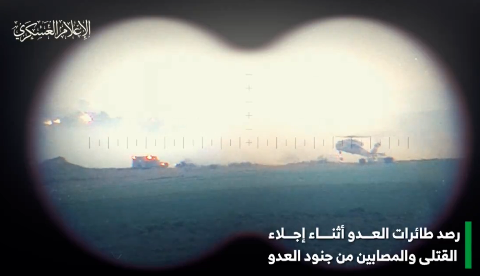 كما عرضت لقطات، لرصد طائرات الإخلاء الطبي للاحتلال، خلال نقلها القتلى والمصابين من مناطق المعارك الضارية.