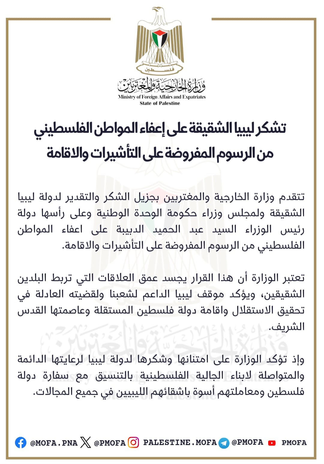 وعبرت وزارة الخارجية والمغتربين بدولة فلسطين عن الشكر والتقدير للقرار الذي اتخذته الدولة الليبية باعفاء المواطن الفلسطيني من الرسوم المفروضة على التأشيرات والاقامة.