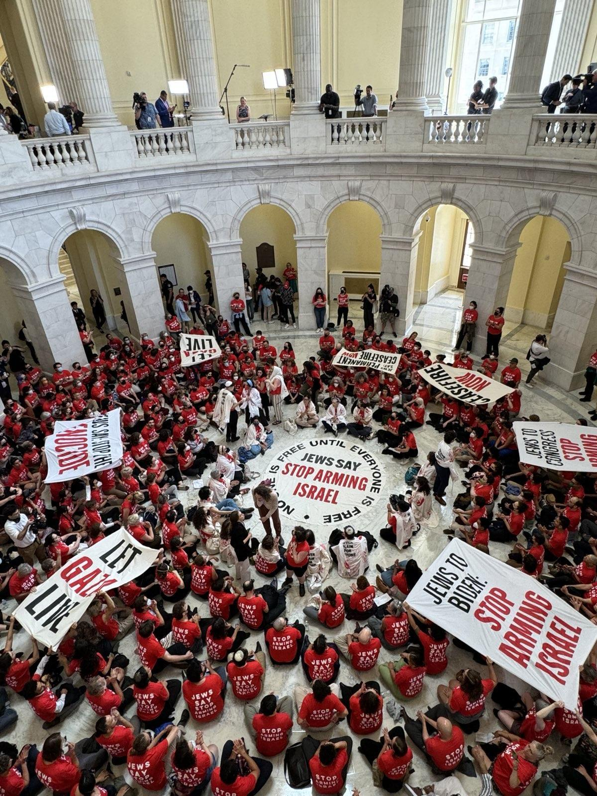 اقتحم نشطاء يهود الباحة الخارجية للكونجرس الأميركي للمطالبة بوقف الحرب على غزة ولرفض زيارة نتنياهو المرتقبة، ورفعوا لافتات تندد بالإبادة الجماعية في غزة وتطالب بوقف تسليح الاحـتلال، والشرطة الأميركية تحاول فض اعتصامهم.