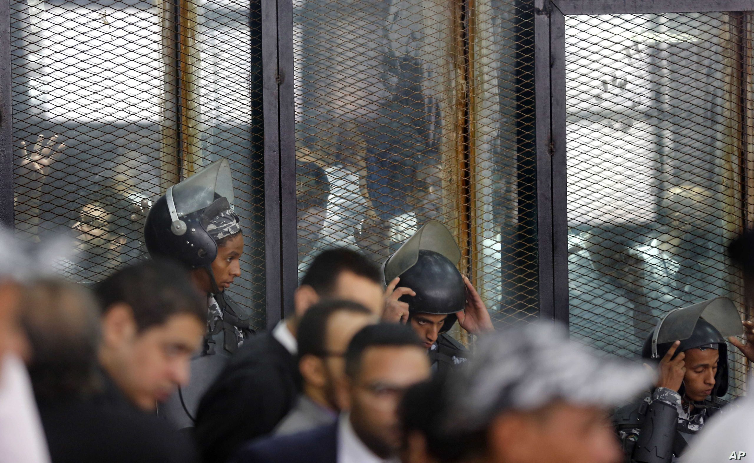 Policemen guard 739 defendants at a soundproof glass cage inside a makeshift courtroom in Tora prison in Cairo, Egypt, Saturday, July 28, 2018. Egypt's state-run media says a court has sentenced 75 people to death, including top figures of the outlawed Muslim Brotherhood group, for their involvement in a 2013 sit-in. (AP Photo/Amr Nabil)