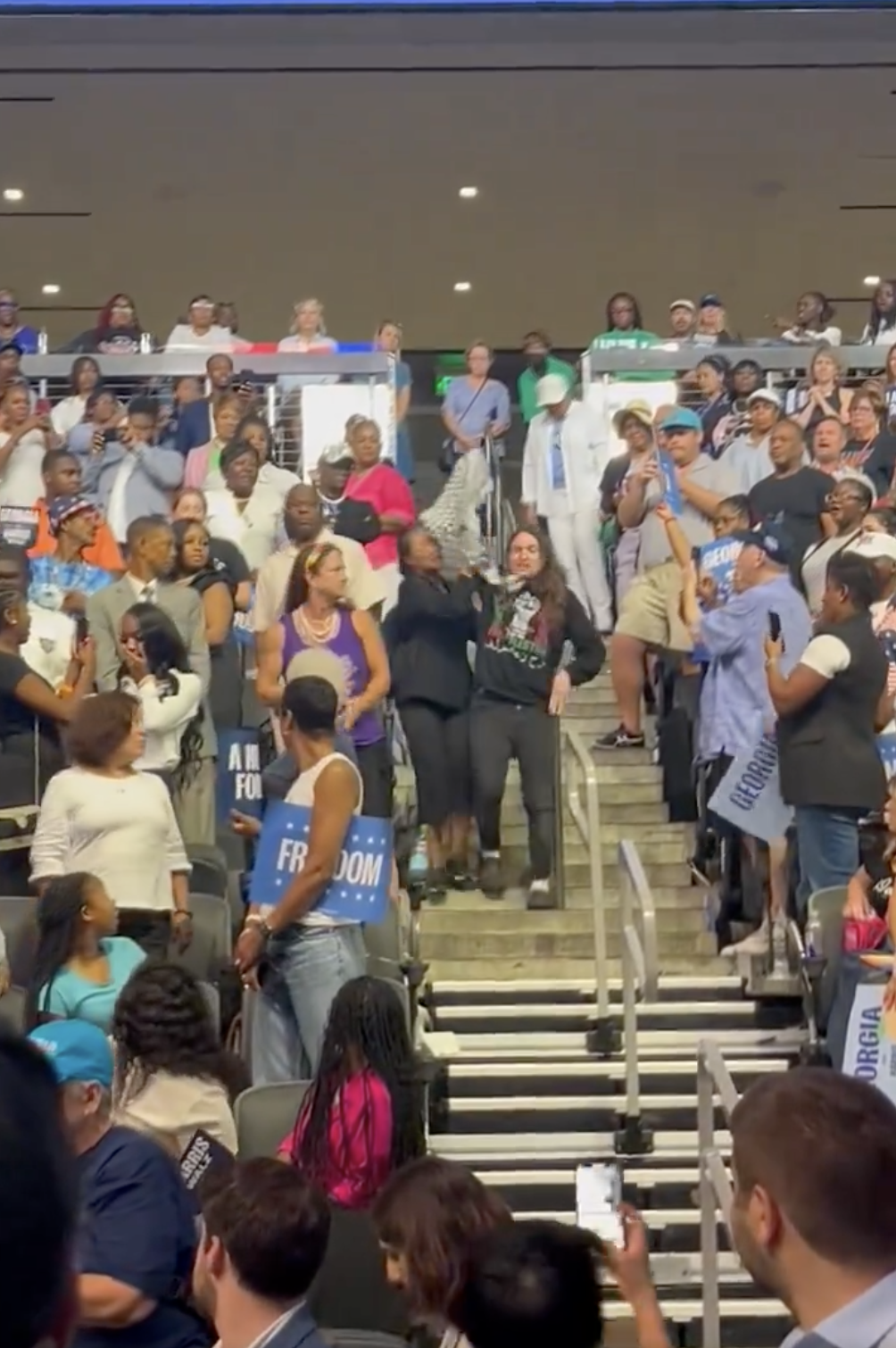 قاطع معارضون لحرب غزة كلمة المرشحة الديمقراطية على مقعد الرئاسة في الولايات المتحدة الأميركية كامالا هاريس خلال خطابها بتجمع انتخابي بولاية جورجيا.
