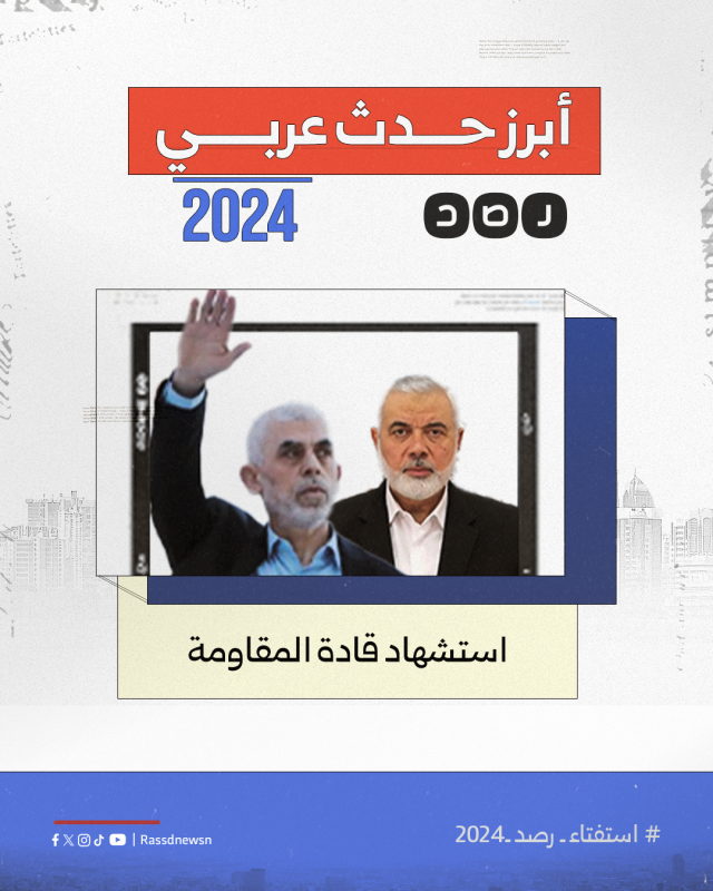 أما بالنسبة للأحداث العربية، فقد احتل استشهاد قادة المقاومة المركز الأول كأبرز حدث عربي خلال عام 2024 بنسبة تصويت بلغت 38%، فيما جاء انتصار الثورة السورية بالمركز الثاني بنسبة تصويت 35%.