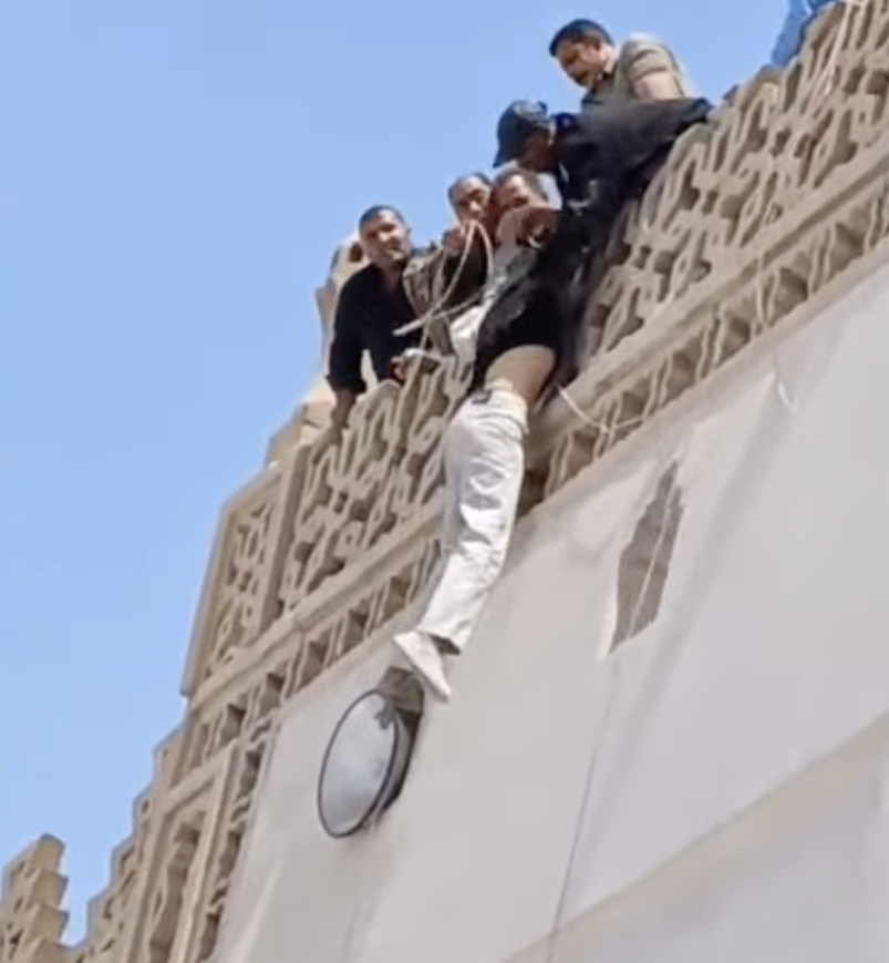 وتظهر اللقطات، رجلا تدلى من سطح المسجد، مهددا بإلقاء نفسه، فيما قام عدد من الأشخاص بمحاولة ثنيه وإمساكه خوفا من سقوطه.