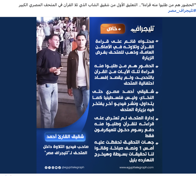 وحسب صحف محلية أطلقت وزارة السياحة والآثار تحقيقا عاجلا بعد تداول مقطع مصور يظهر شابا يتلو آيات من القرآن الكريم بصوت مرتفع داخل المتحف المصري الكبير.