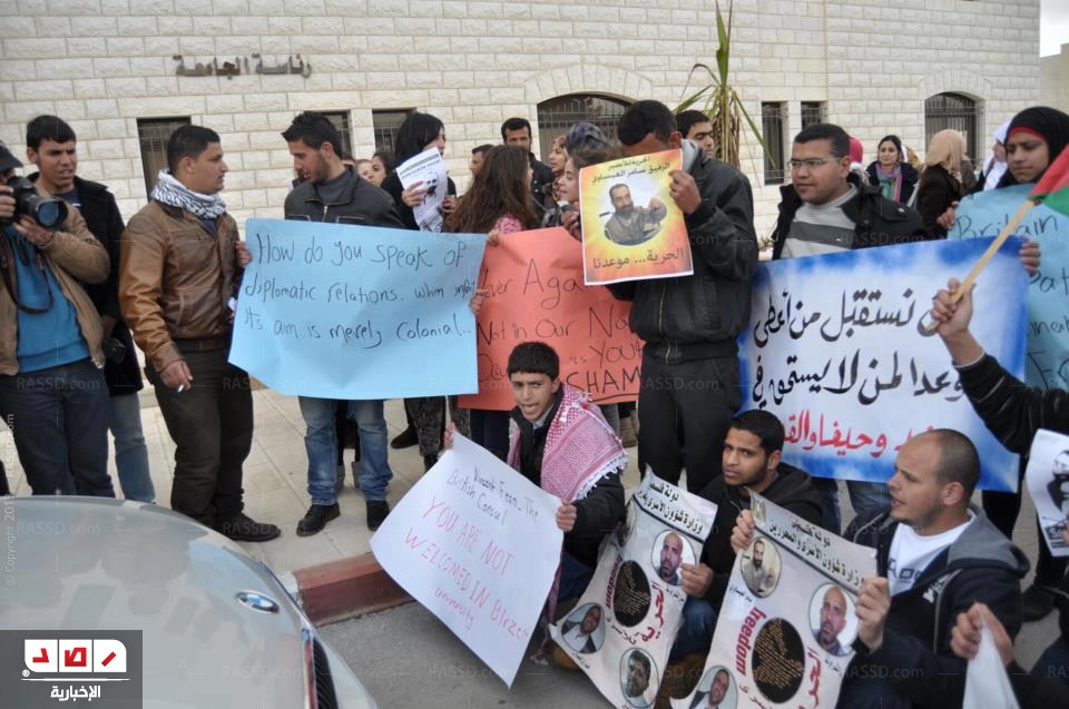 منع طلاب جامعة بيرزيت – شمال رام الله – القنصل البريطاني العام – من إلقاء محاضرة بالجامعة اليوم كان سيلقيها أمام طلبة العلوم السياسية بعنوان "العلاقات السياسية البريطانية الفلسطينية في المنطقة" وأجبروه علي مغادرة الجامعة .