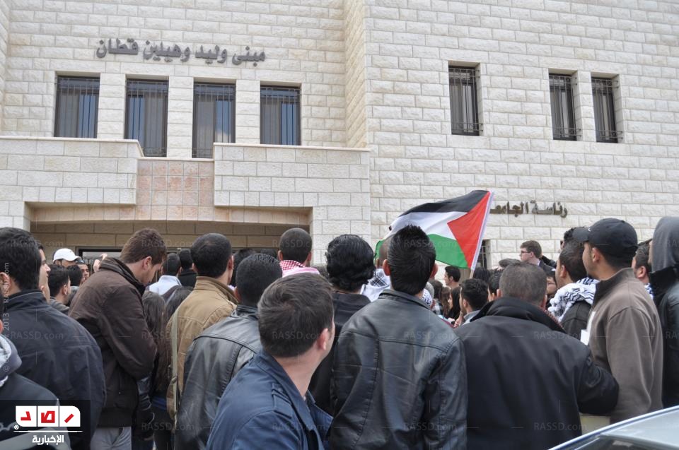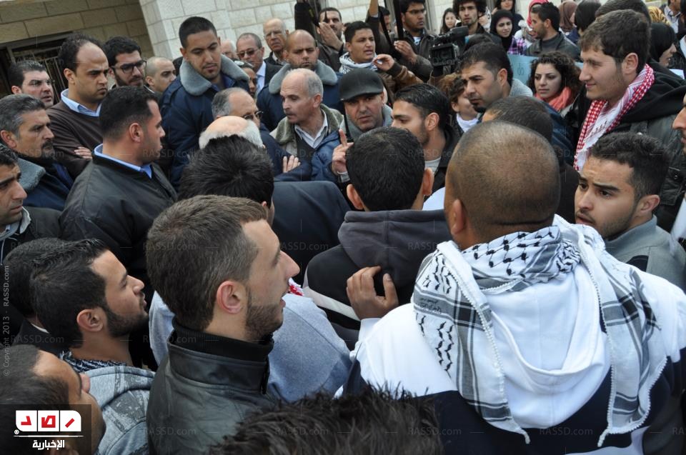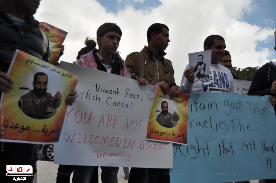 ووقف طلاب جامعة بيرزيت أمام مبنى رئاسة الجامعة وهتفوا ضد "فنسنت فين "القنصل البريطاني العام المتواجد داخل المبنى، بحسب رواية بعض الطلاب.