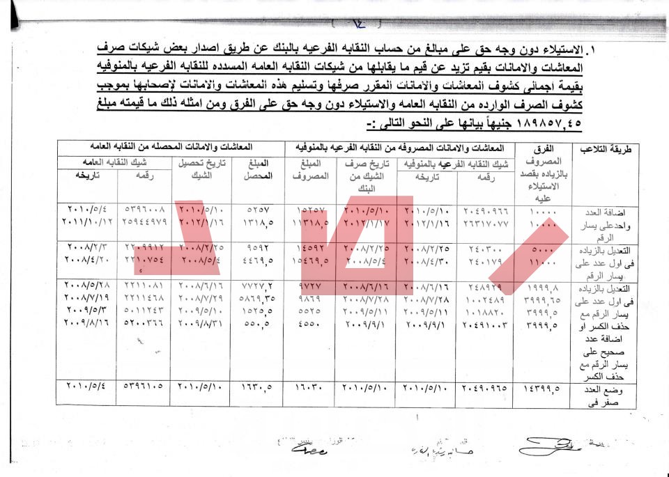 و تكشف التقارير الاستيلاء على مبالغ من النقابة الفرعية بالبنك عن طريق صرف الشيكات كملاحق دفعات معاشات وهمية لا أصل لها بالنقابة العامة حيث لا يقابلها شيكات مسددة من النقابة العامة لهذا الغرض و إنما لغرض تسوية حساب المدينين.