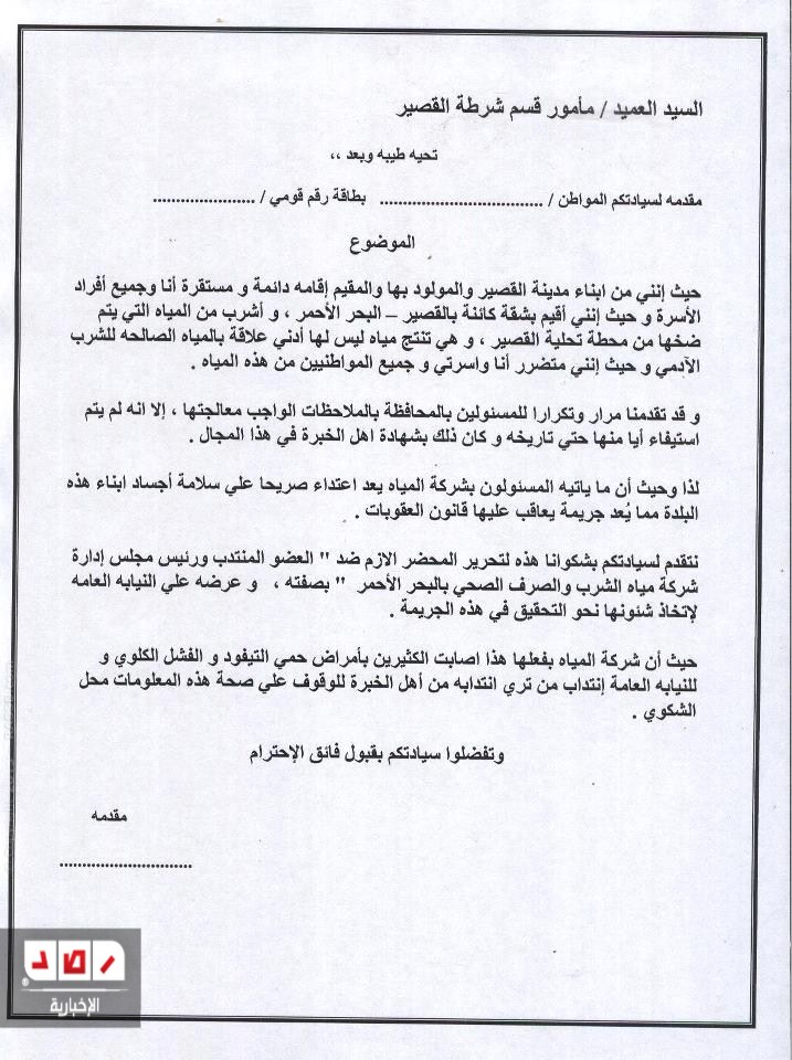 دشن شباب مدينة القصير بمحافظة البحر الأحمر اليوم حملة جماعية لتحرير محاضر جماعية ضد " اللواء محمد كامل " محافظ البحر الأحمر بصفته " والمهندس ناجح محمد احمد" رئيس مجلس إدارة شركة مياه الشرب والصرف الصحي , واللواء " شريف زهران " رئيس مدينة القصر .