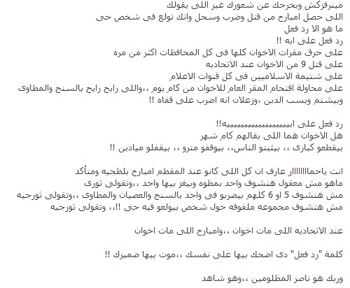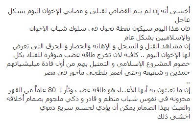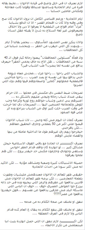 في أعقاب أحداث يوم الجمعة الماضية انتشرت موجة من الغضب والحنق في صفحات موقع التواصل الاجتماعي " فيس بوك " وخصوصا على صفحات شباب جماعة الاخوان المسلمين في أعقاب الأحداث التي جرت في المقطم أمام مقر مكتب الارشاد .