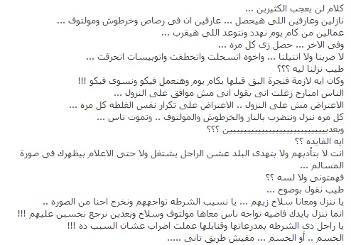 أما محمد إبراهيم فقال "كلام لن يعجب الكثيرين، الاخوان ذهبوا وهم يعرفون ما سيحدث، يعلمون أن هناك رصاص وخرطوش ومولوتوف، الاخوان يهددون ويتوعدون لكل من سيقترب منذ عدة أيام ، وفي النهاية يحدث ما يحدث كل مرة"