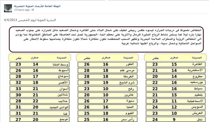 وأشارت الهيئة عبر صفحتها عل موقع التواصل الاجتماعي "فيسبوك" استمرار نشاط الرياح المثيرة للرمال والأتربة على معظم أنحاء الجمهورية تصل لحد العاصفة على المناطق المكشوفة ، مما يؤدي لانخفاض الرؤية ، واضطراب الملاحة البحرية ، وتظهر السحب المنخفضة وتكون متكاثرة شمالا يصاحبها سقوط الأمطار على السواحل الشمالية ، وشمال سيناء .
