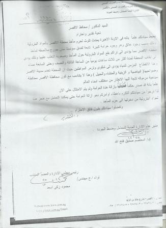 قامت الادارة العامة للمعامل و ضبط الجودة بشركه مياه الشرب و الصرف الصحى بالأقصر بمخاطبة محافظ الاقصرالحالى عزت سعد فى 25 ديسمبر2012  و شرح المشكلة له و حثه على اتخاذ الإجراءات اللازمة لازاله البناء الحديدي بعد ان شهدت الاقصر عده تظاهرات امام مقر شركة المياه و الصرف الصحى بسبب الانقطاع المزمن للمياه عن مدينة الاقصر وضواحيها " البياضية و الزينية و المنشاةو الحبيل " لا يتناسب مع مكانه المحافظة السياحية المرموقة.